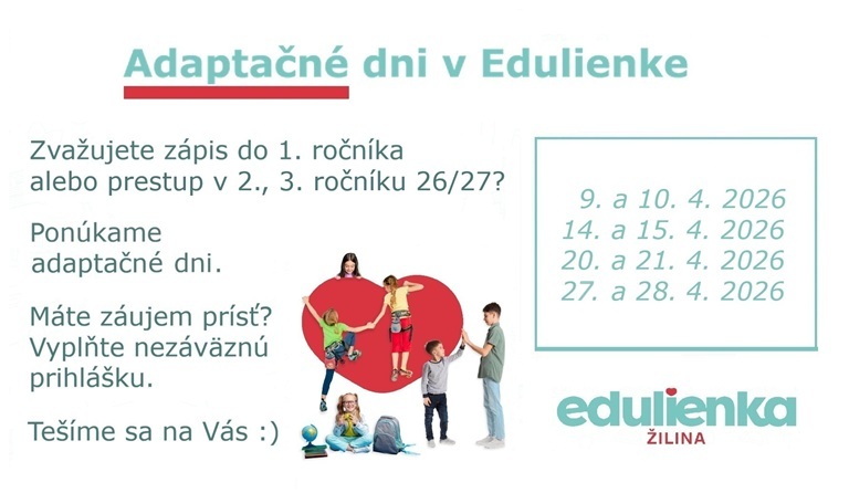 Zvažujete zápis do 1. ročníka 2026/27 v Edulienke Žilina? Navštívte nás. Najbližší Deň otvorených dverí je 16. 04. 2026, v čase 8:30 – 10:30 hod. Tešíme sa na Vás.